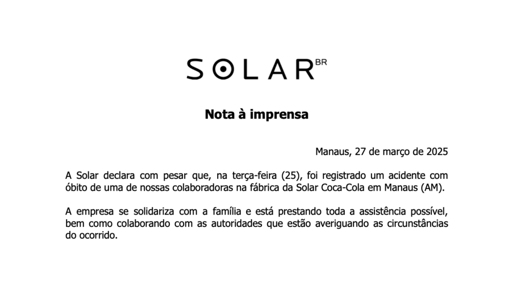 Manaus – A Solar Coca-Cola, responsável pela produção da famosa bebida em Manaus, emitiu uma nota oficial nesta quinta-feira (27/3) lamentando a morte da jovem Karla Gabriela Barbosa Ribeiro Costa, de 29 anos, vítima de um acidente de trabalho envolvendo uma empilhadeira. O comunicado, divulgado após o ocorrido na fábrica localizada na Avenida Torquato Tapajós, bairro Novo Israel, diz: “A Solar declara com pesar que, na terça-feira (25), foi registrado um acidente com óbito de uma de nossas colaboradoras na fábrica da Solar Coca-Cola em Manaus (AM). A empresa se solidariza com a família e está prestando toda a assistência possível, bem como colaborando com as autoridades que estão averiguando as circunstâncias do ocorrido.”