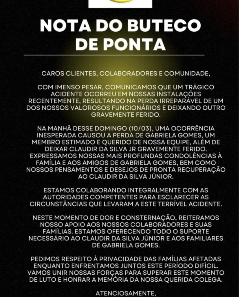 Após a colisão, o funcionário do Buteco de Ponta foi submetido a uma cirurgia de emergência para reparar as fraturas em suas pernas. Placas de platino foram inseridas para auxiliar no processo de estabilização e cicatrização óssea, e ele agora está se recuperando sob os cuidados médicos.