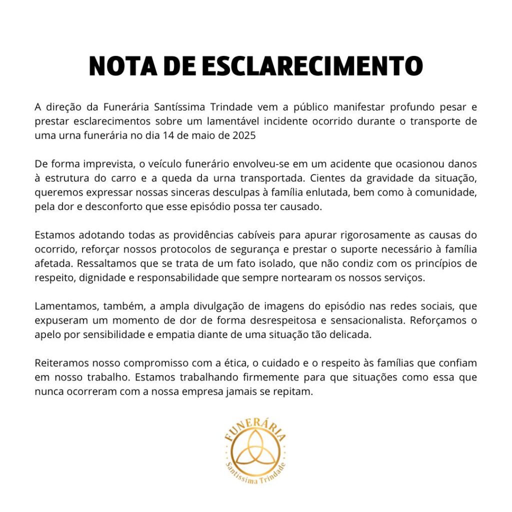 Em nota oficial, a Funerária Santíssima Trindade lamentou profundamente o ocorrido, classificando o incidente como um caso isolado e incompatível com seus valores de respeito e cuidado. “Estamos consternados com o acidente e pedimos sinceras desculpas à família enlutada e à comunidade. Nosso compromisso sempre foi oferecer um serviço pautado na ética e na dignidade. Já iniciamos uma apuração interna para identificar as causas do incidente e reforçar nossos protocolos de segurança”, informou a empresa. A funerária também afirmou estar prestando todo o suporte necessário à família afetada.