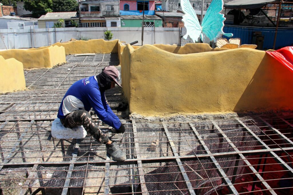 E a terceira parte desse cenário, das aves, com um ninho, está na etapa de ferragem e infraestrutura. Logo em seguida, será feita a concretagem e colocação de aves como papagaios, beija-flor, galo da serra, tucano e arara.