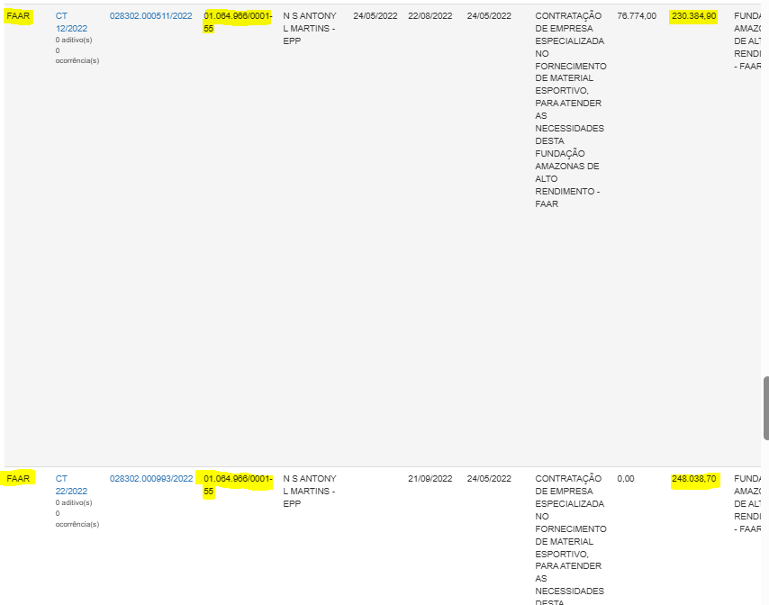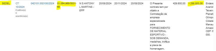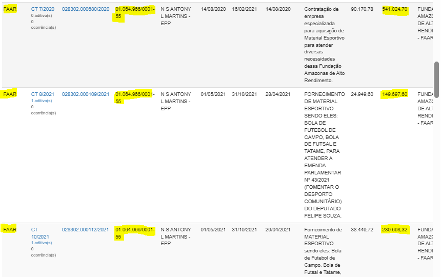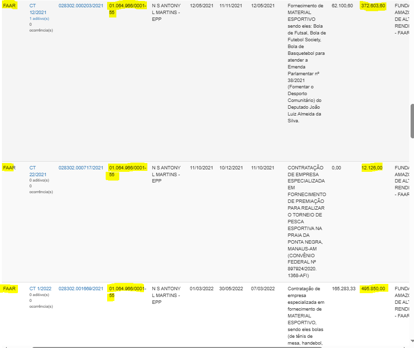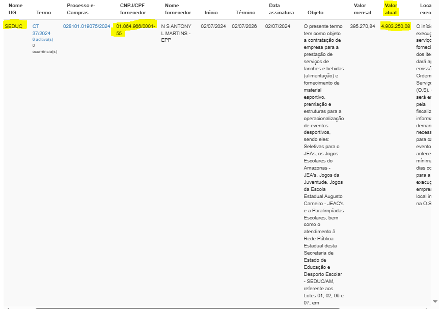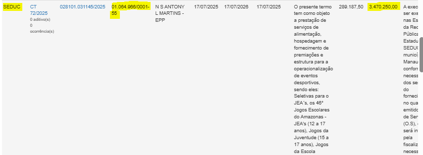 As contratações envolvem diversos órgãos e fundações estaduais, como a Secretaria de Estado de Educação (Seduc), a Fundação Amazonas de Alto Rendimento (Faar), a Secretaria de Assistência Social (SEAS), a Fundação de Assistência Social (FEAS) e a Secretaria de Desporto e Lazer (Sedel). No total, os contratos somam R$ 15.197.461,67, conforme registrado no Portal da Transparência do Estado do Amazonas.