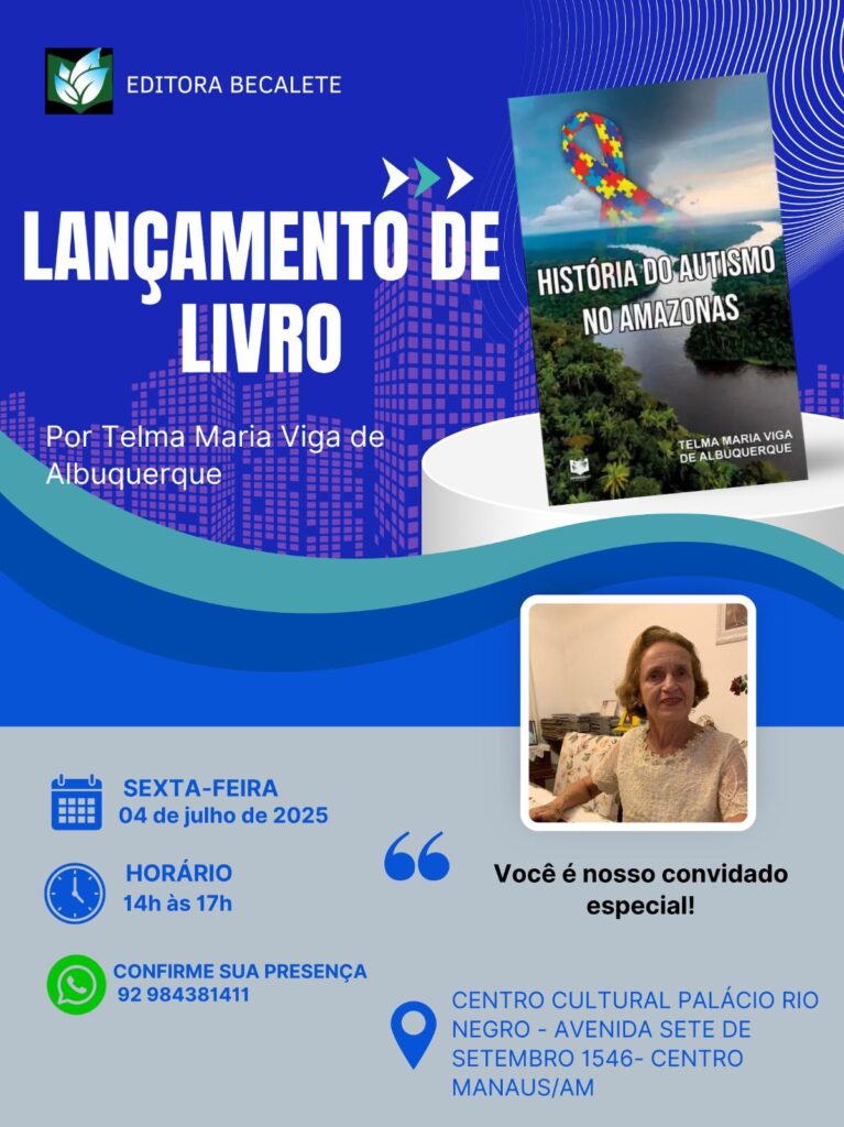 Manaus – A escritora Telma Maria Viga de Albuquerque lança, nesta sexta-feira (4), sua mais nova obra: o livro “História do Autismo no Amazonas”. O evento acontecerá das 14h às 17h, no Centro Cultural Palácio Rio Negro, localizado na avenida Sete de Setembro, no Centro de Manaus. A entrada é gratuita.