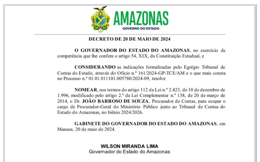 A nomeação de João Barroso foi publicada no Diário Oficial do Estado no dia 20 de maio. Barroso traz uma vasta experiência ao cargo, tendo já ocupado a chefia do MPC-AM nos biênios 2018/2020 e 2020/2022. Ele substituirá a procuradora de contas Fernanda Cantanhede Veiga Mendonça, que ocupou o cargo no biênio 2022/2024.