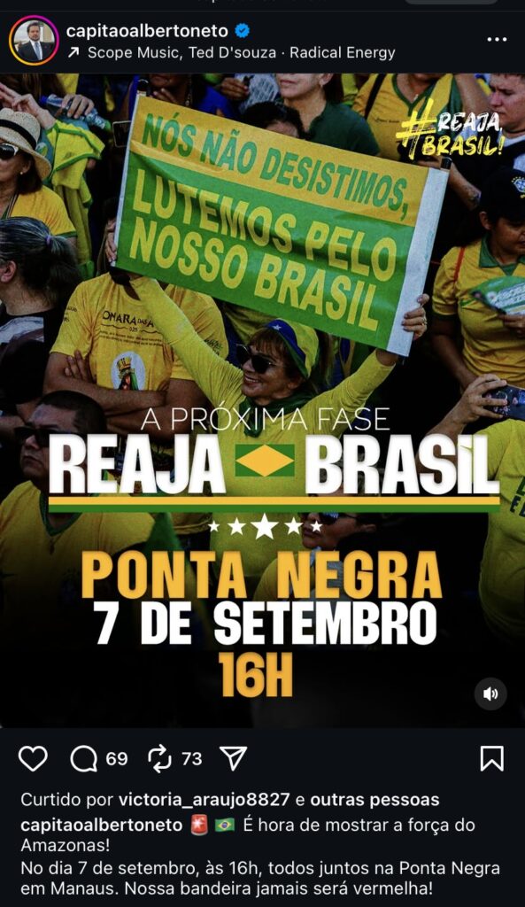 Enquanto as forças armadas se apresentam no Sambódromo, a zona Oeste de Manaus será palco de outro tipo de mobilização. A direita amazonense volta a convocar apoiadores para um ato batizado de “Reaja Brasil”, marcado para as 16h na Ponta Negra.