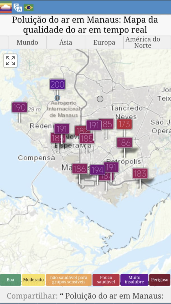 Para se ter ideia, de acordo com o site IQAir, que monitora a qualidade de ar em todo o mundo, Manaus registrou diversos bairros da cidade com qualidade do ar considerada ˜muito insalubre”.