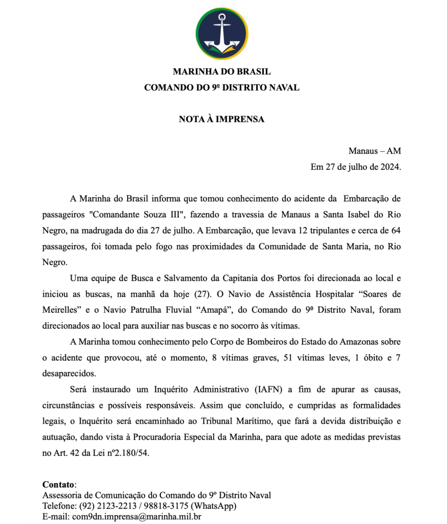 Manaus – A Marinha do Brasil, por meio de nota, confirmou um óbito no grave caso de explosão em uma balsa na madrugada deste sábado (27).