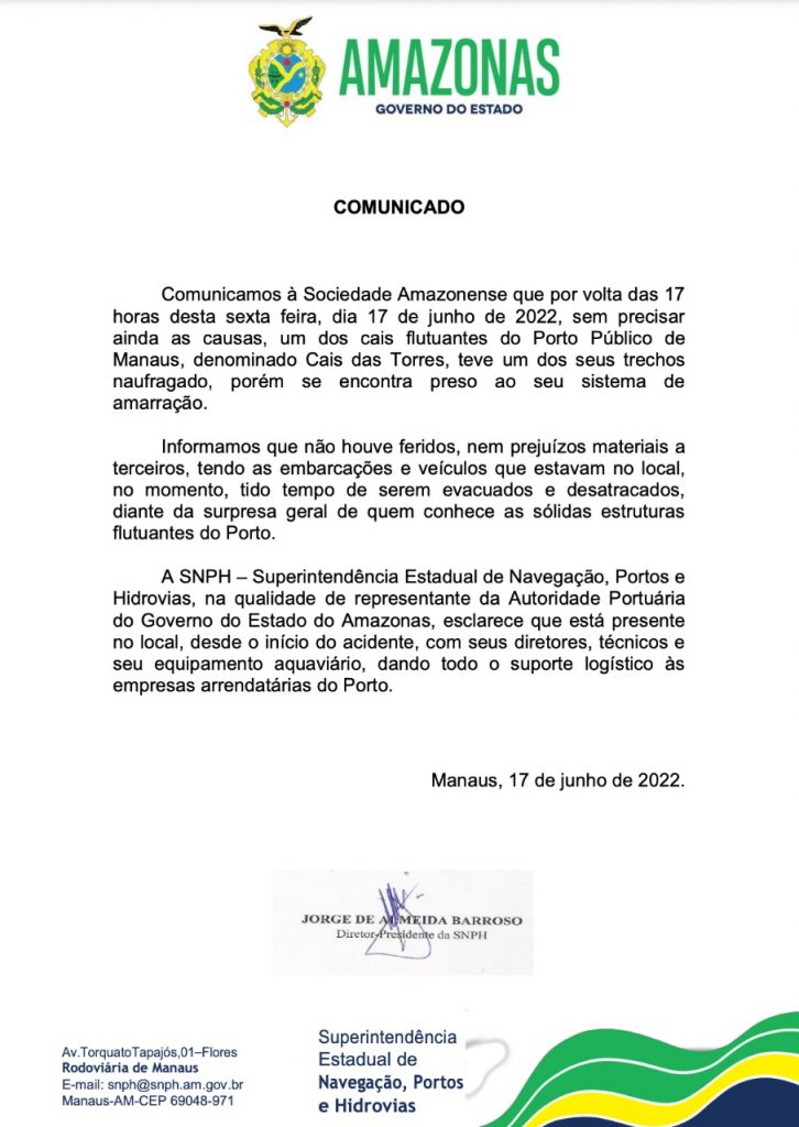 A Equipe de Manutenção da Empresa de Revitalização do Porto de Manaus S/A já está no local, preservando a segurança de todos, com a situação sob total controle. Além disso, está em contato com autoridades pra fazer o levantamento de danos, apurar os fatos e recuperar a área o mais breve possível.
