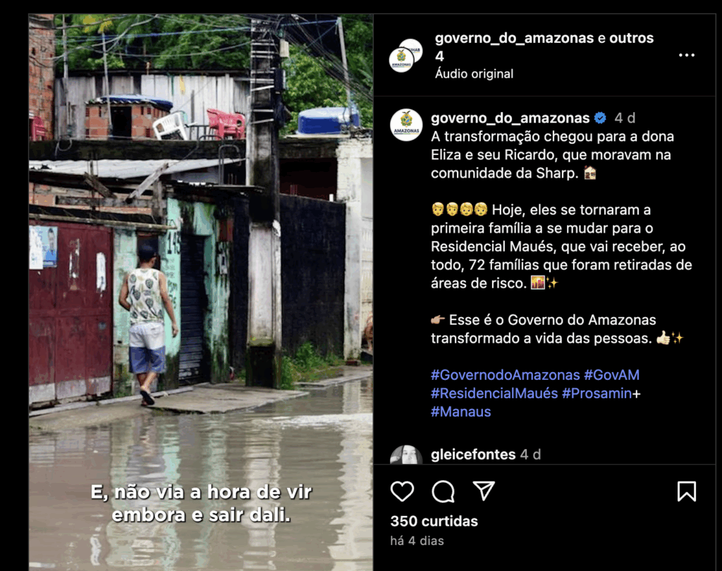 Apesar de o Governo do Amazonas ter anunciado em suas redes sociais que a vida dos moradores foi “transformada”, a situação enfrentada pelas famílias mostra um contraste gritante com a propaganda oficial. Em uma publicação recente, o governo celebrou a transferência de algumas famílias para o Residencial Maués, citando o caso da dona Eliza e do seu Ricardo como exemplo de sucesso. A publicação afirma: