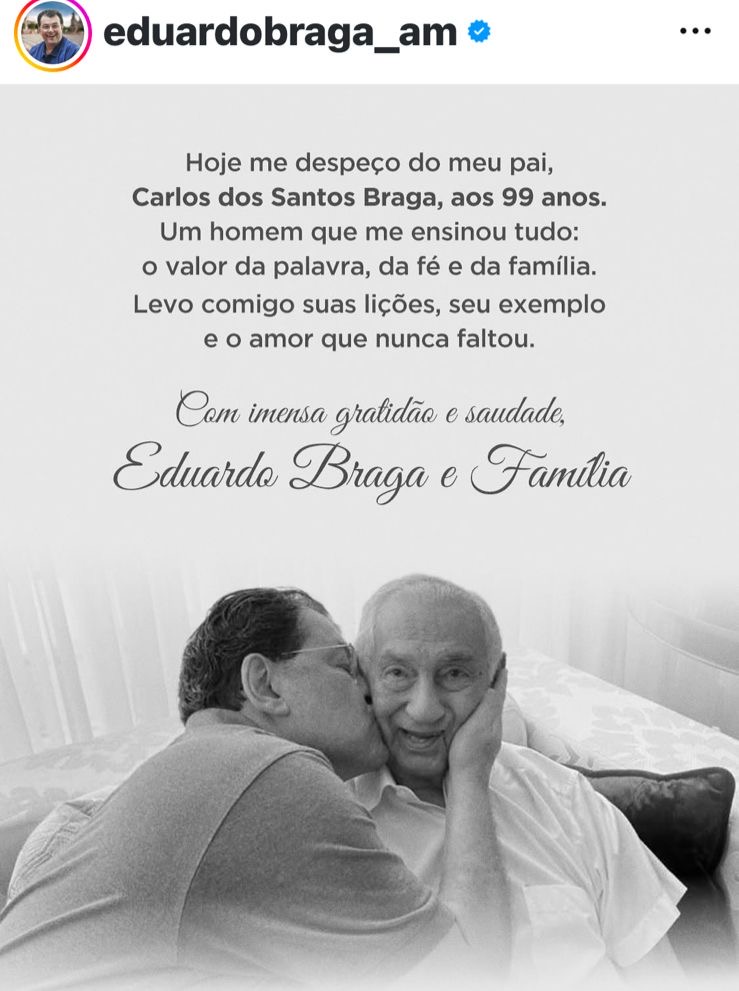 Em uma homenagem emocionante, Eduardo Braga se despediu do pai com palavras que tocam o coração: “Hoje me despeço do meu pai, Carlos dos Santos Braga, aos 99 anos. Um homem que me ensinou tudo: o valor da palavra, da fé e da família. Levo comigo suas lições, seu exemplo e o amor que nunca faltou. Com imensa gratidão e saudade.” A declaração comoveu amigos, familiares e admiradores que acompanham a trajetória pública e pessoal do senador.