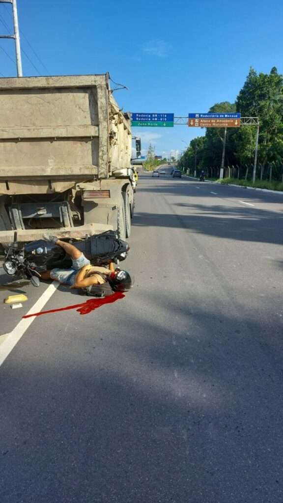 A vítima trafegava sentido Torquato Tapajós quando colidiu violentamente contra a traseira de uma caçamba que recolhia entulhos do canteiro central da avenida.