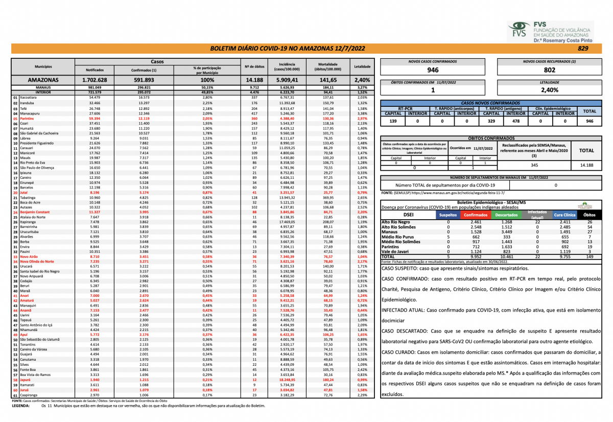 Manaus – O Amazonas registrou 946 novos casos de Covid-19, totalizando 591.893 casos da doença. Ainda segundo o boletim divulgado nesta terça-feira (12), um óbito foi registrado nas últimas 24h, atualizando para 14.189 mortes pelo vírus no estado.