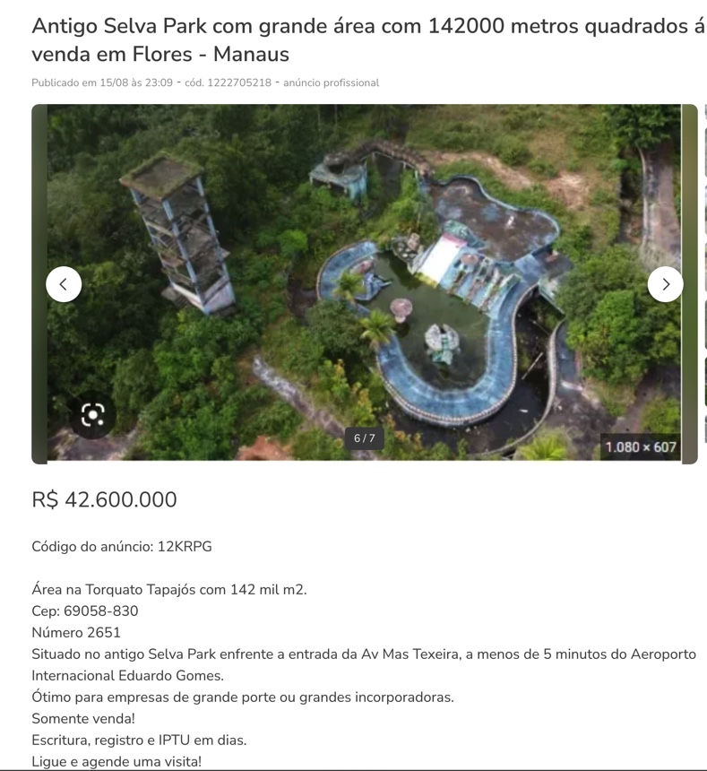 Quem visita a OLX pode conferir o anúncio que coloca à disposição a área do antigo balneário Selva Park, localizado na avenida Torquato Tapajós. A Schaefer Imóveis, empresa responsável pelo anúncio, confirmou a autenticidade das informações. O anúncio representa uma oportunidade para interessados em adquirir uma parte da história de Manaus e dar um novo destino a esse icônico espaço.