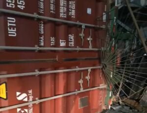 Carreta tomba e destrói muro e carros no Japiim; Veja vídeo