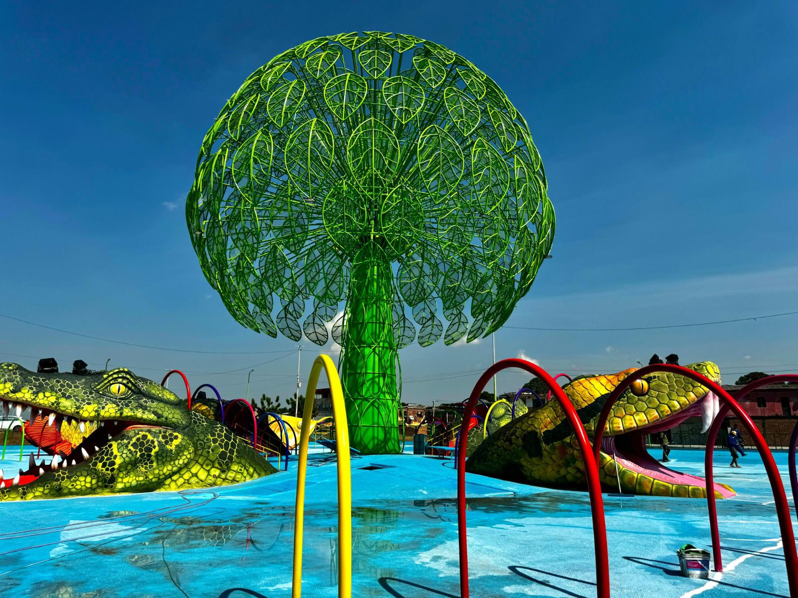 O espaço tem uma cobra sucuri de 30 metros de comprimento; uma gigante iguana, onças, macacos, arraias, peixes, aves, sapos, jacarés e outros seres tão conhecidos da região. E o gigantismo da obra segue com a maior praça molhada da cidade, com 3,6 mil metros quadrados, que tem ao centro a “Árvore da Vida”, com 15 metros de altura por 15 metros de diâmetros, que funciona com esguichos de água para a todos refrescar, em um labirinto de folhas de aço, para ser explorado tridimensionalmente. Na praça molhada, são permitidas crianças até 12 anos.