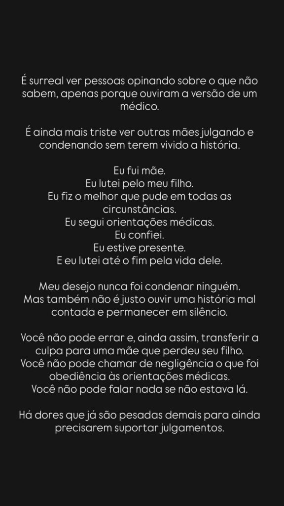 No texto, ela destaca que seguiu todas as orientações médicas e lutou até o fim pela vida do filho.