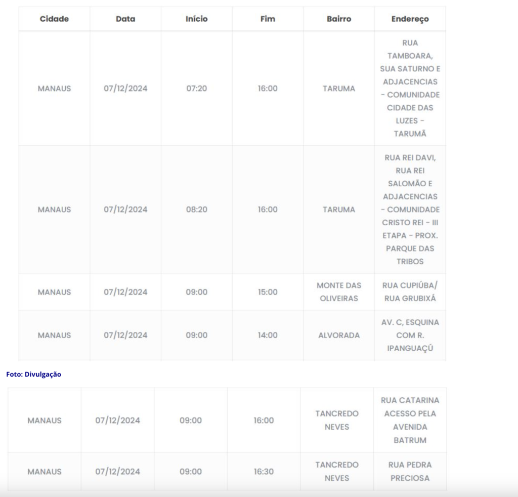 A Amazonas Energia informou que os bairros Alvorada, Monte das Oliveiras, Tarumã e Tancredo Neves serão afetados.