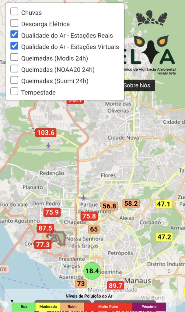 Outro impacto que traz preocupações sao os inúmeros focos de incêndio e também a cortina que enconbre a cidade tornando o ar insalubre conforme mostra o SELVA – Sistema Eletrônico de Vigilância Ambiental.