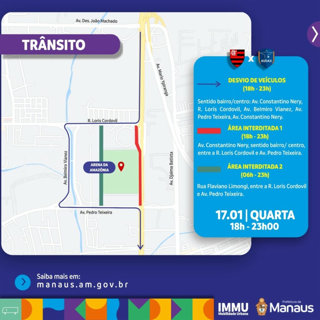 Manaus – A Prefeitura de Manaus, por meio do Instituto Municipal de Mobilidade Urbana (IMMU), irá realizar desvios no trânsito e transportes nas vias que dão acesso à Arena da Amazônia, nesta quarta-feira, 17/1, na zona Oeste da cidade. A medida é para permitir que os torcedores acessem o estádio com segurança.