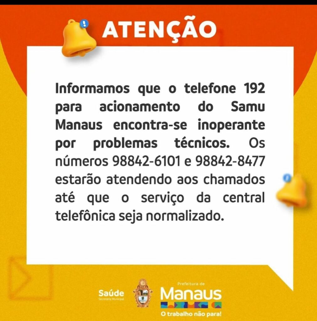 Manaus – A Secretaria Municipal de Saúde de Manaus (Semsa) anunciou nesta quinta-feira (4) que o Serviço de Atendimento Móvel de Urgência (Samu) enfrenta problemas técnicos em seus números de acionamento.