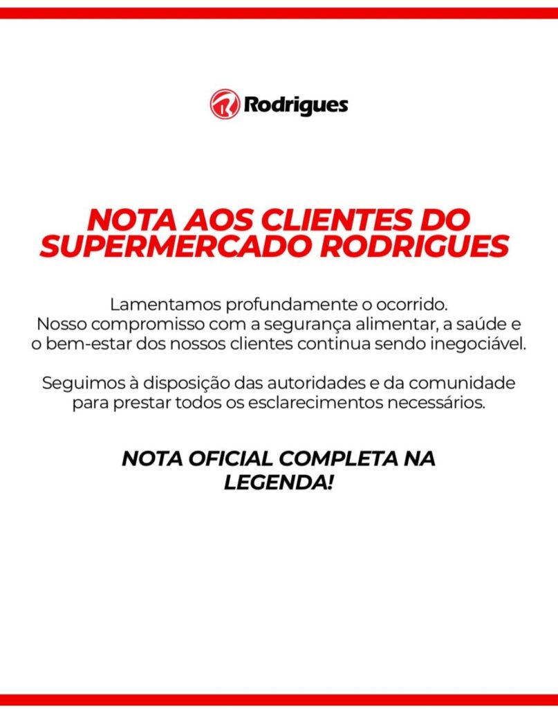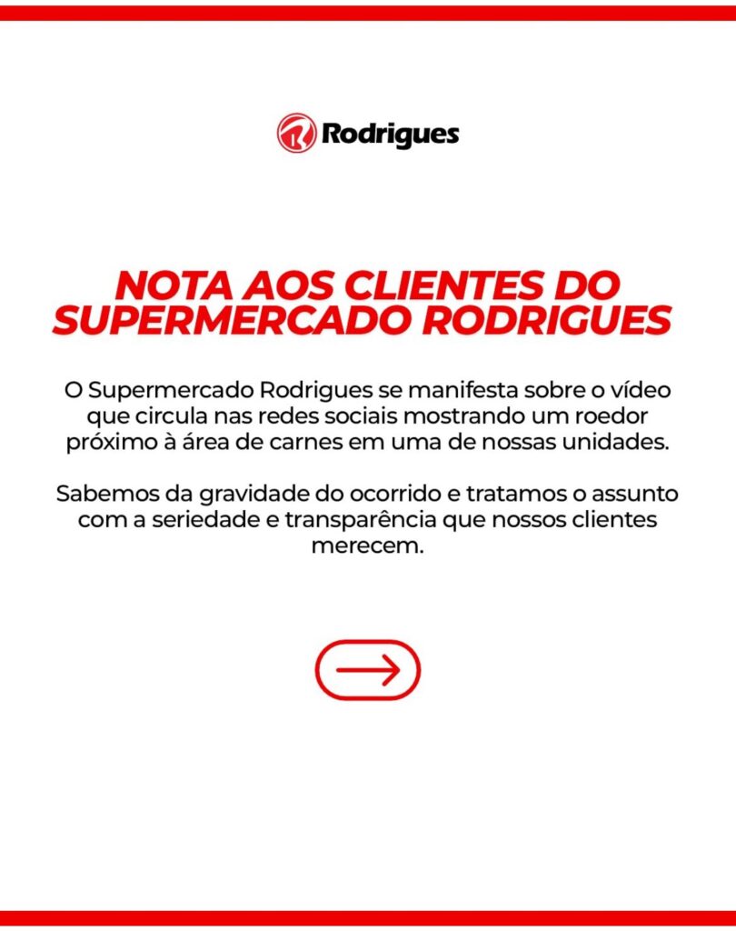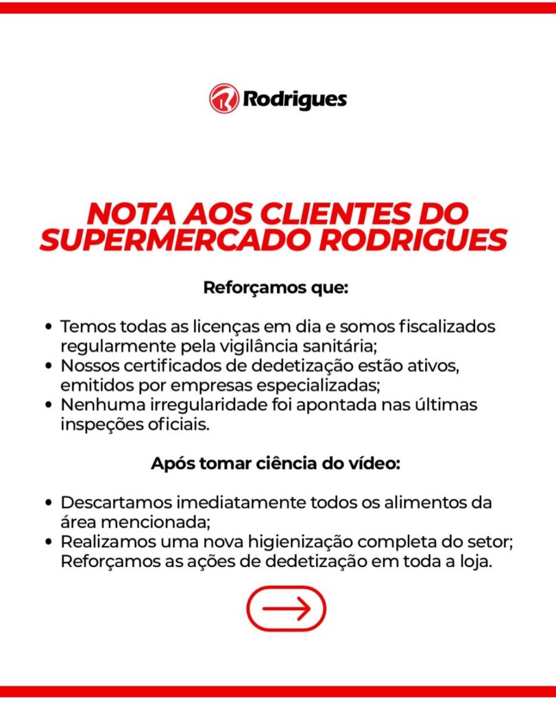 Em nota, o Supermercado Rodrigues afirmou que trata o caso com “máxima seriedade e transparência” e reiterou o compromisso com a segurança alimentar. A empresa declarou que possui todas as licenças de funcionamento em dia e contratos ativos de dedetização com empresas especializadas. Além disso, informou que passou recentemente por fiscalização da Vigilância Sanitária, sem que tenham sido apontadas irregularidades.