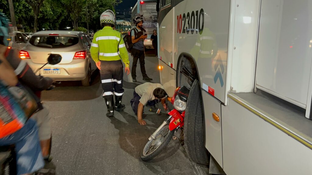 A motocicleta foi parar embaixo da roda do ônibus que estava próximo e acabou sendo esmagada, enquanto a mulher teve a sorte de cair para o lado oposto e saiu ilesa do acidente. O incidente causou retenção no trânsito local, dificultando a circulação de veículos na área.