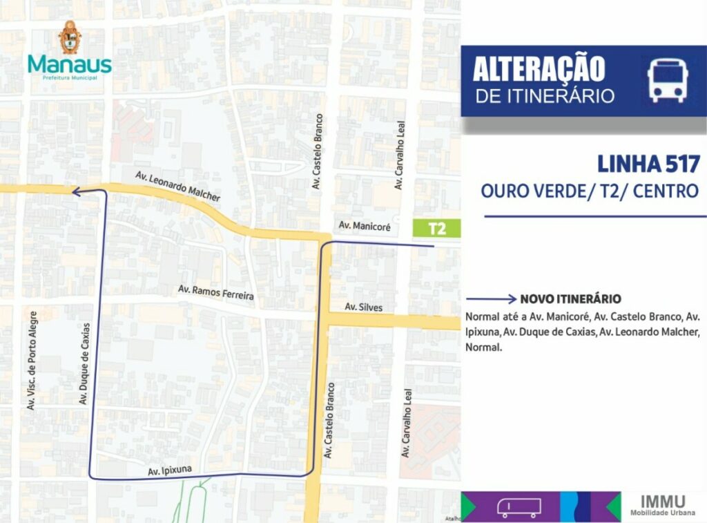 Com a mudança, a linha 517 seguirá o itinerário normal até a avenida Manicoré, depois segue as avenidas Castelo Branco, Ipixuna e Duque de Caxias, a partir de onde continua no trajeto normal.