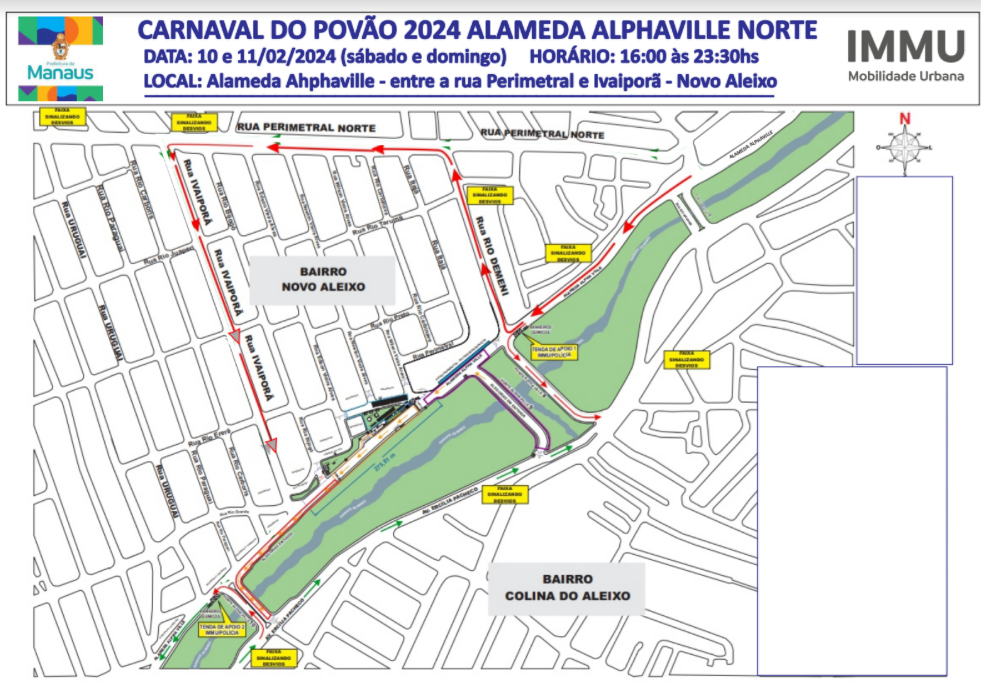 O ‘Carnaval do Povão’, que ocorre na alameda Alphaville, no bairro Novo Aleixo, zona Norte, no sábado, 10, e domingo, 11, também receberá apoio das equipes de trânsito. As interdições no local acontecem 16h e 23h30 atingindo a alameda Alphaville, rua Perimetral e rua Ivaiporã.