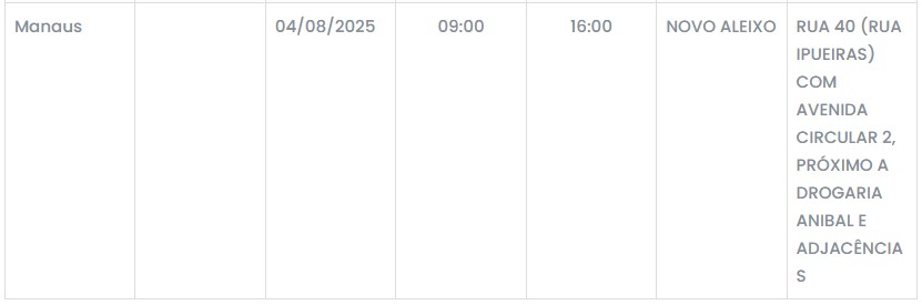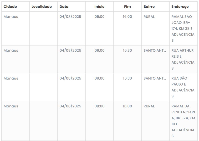 Manaus – Moradores de áreas específicas dos bairros Santo Antônio, na zona oeste, e Novo Aleixo, na zona norte da capital amazonense, devem se preparar para uma interrupção temporária no fornecimento de energia elétrica nesta segunda-feira (4).