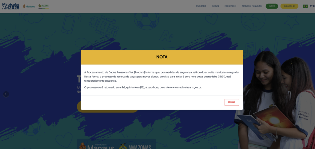 “A Prodam informa que, por medidas de segurança, retirou do ar o site matriculas.am.gov.br. Dessa forma, o processo de reserva de vagas para novos alunos, previsto para iniciar a zero hora desta quarta-feira (15), está temporariamente suspenso. A Prodam está realizando uma análise minuciosa do cenário para garantir a retomada do serviço com estabilidade e segurança”, diz a nota.