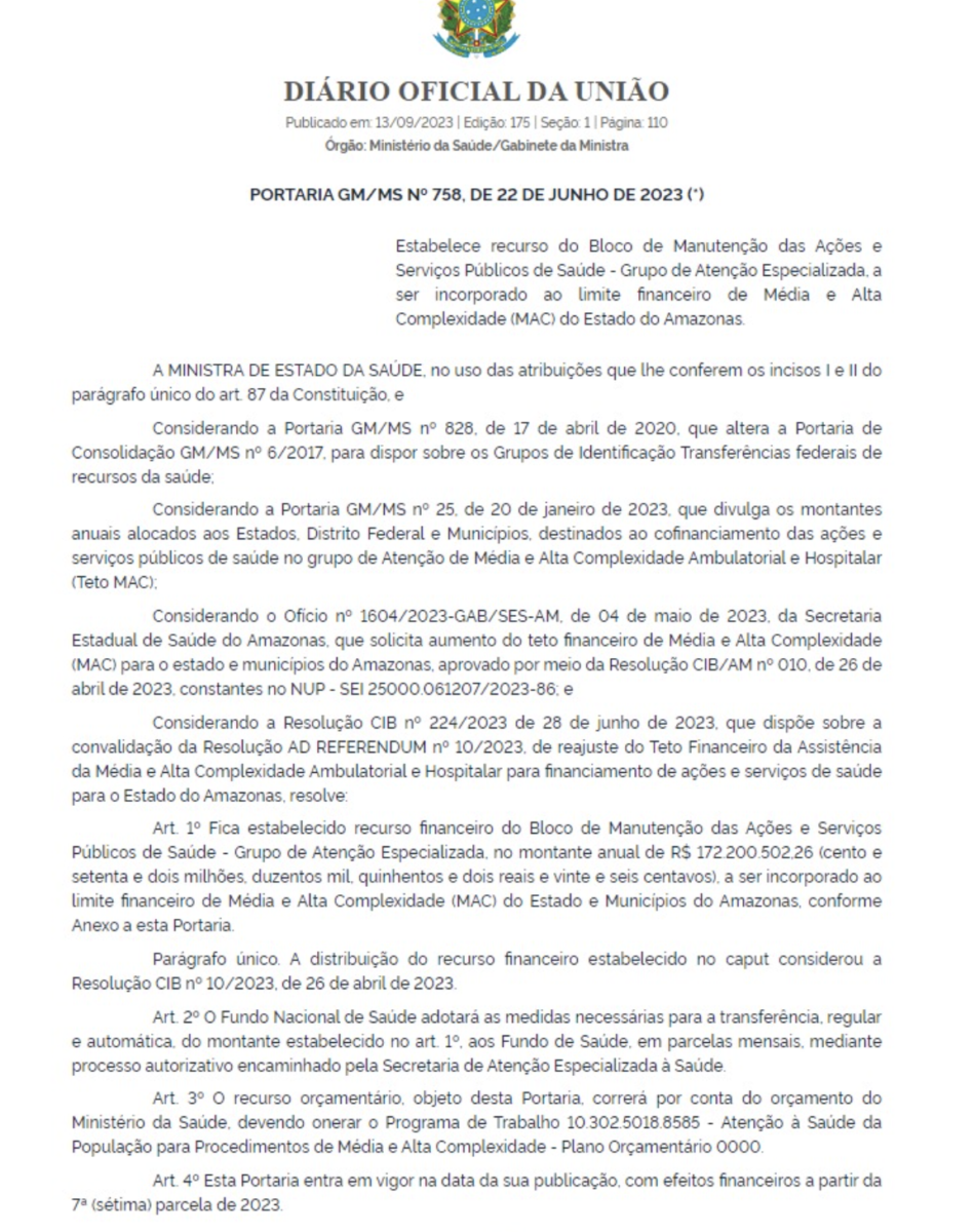 Brasil – A atual Ministra da Saúde do governo Lula, Nísia Trindade, anunciou uma medida decisiva para fortalecer os serviços de saúde no Estado do Amazonas. Através da Portaria GM/MS nº 758, datada de 22 de junho de 2023 e publicada nesta quarta-feira (13), a ministra estabeleceu a alocação de recursos do Bloco de Manutenção das Ações e Serviços Públicos de Saúde, especificamente destinados ao Grupo de Atenção Especializada. Essa injeção financeira, no valor de expressivos R$ 172.200.502,26, será incorporada ao limite financeiro de Média e Alta Complexidade (MAC) da região, com o objetivo de beneficiar diretamente os municípios amazonenses.