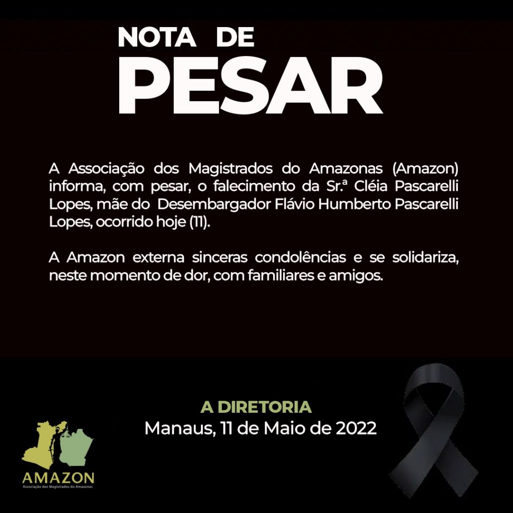 Manaus – Na manhã desta quarta-feira (11), a Associação dos Magistrados do Amazonas (Amazon), informou o falecimento da senhora Cléia Pascarelli Lopes, mãe do desembargador do Tribunal de Justiça do Amazonas (TJAM), Flávio Pascarelli.