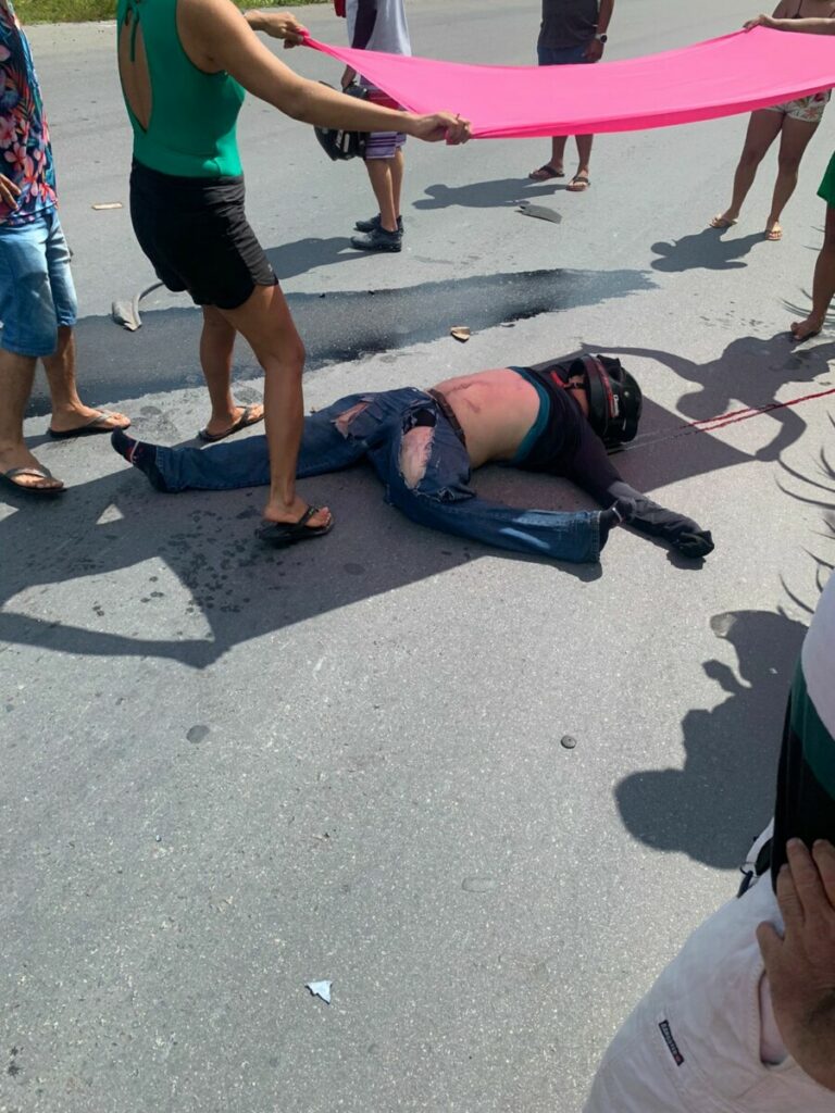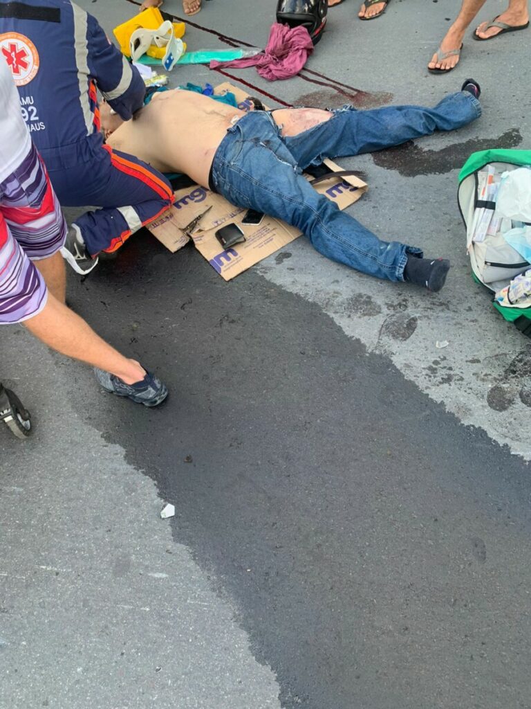 Um motociclista, que trafegava pela via, sofreu uma colisão e ficou gravemente ferido. Imagens mostram a vítima desacordada na via e aparentemente com a perna quebrada.