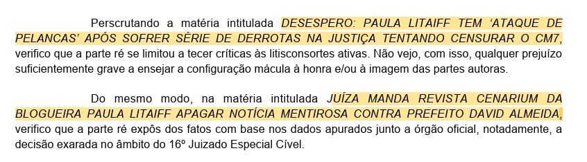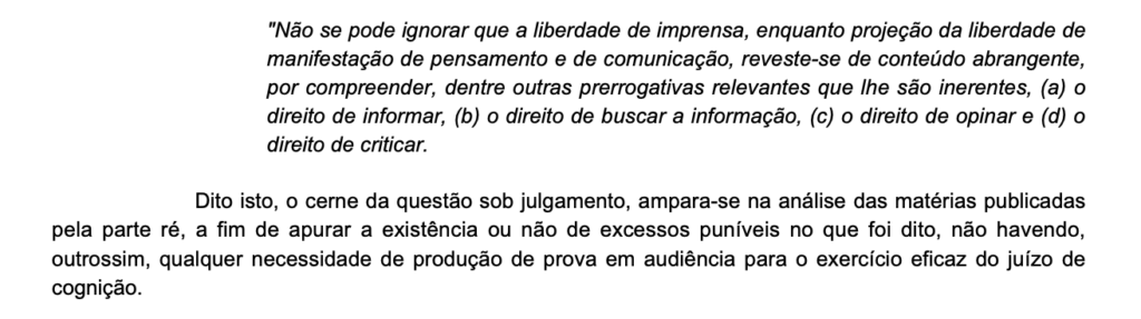 Na sentença, a juíza foi clara ao afirmar que o conteúdo questionado está protegido pela liberdade de imprensa, direito constitucional que garante informar, opinar e criticar, especialmente quando se trata de pessoas com atuação pública e à frente de veículos de comunicação.