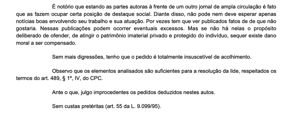 O processo também perdeu força porque as reportagens foram baseadas em dados oficiais e decisões judiciais, o que afastou qualquer alegação de invenção ou ataque pessoal. A magistrada reforçou ainda que o jornalismo trabalha com informação verossímil e que críticas, por si só, não configuram dano moral.