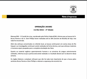 Amazonas – A Polícia Federal (PF), em nota publicada na noite desta segunda-feira (13), reiterou as esperanças de encontrar o indigenista Bruno Pereira e o jornalista britânico Dom Phillips, sumidos no Vale do Javari, no Amazonas, desde 5 de junho.