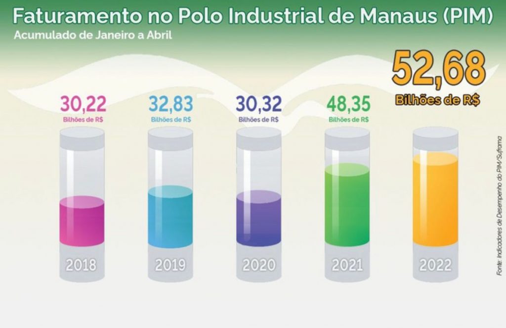 Amazonas – O Polo Industrial de Manaus (PIM) fechou o primeiro quadrimestre deste ano com faturamento de R$ 52,68 bilhões, o que representa aumento de 8,96% em relação ao mesmo intervalo de 2021 (R$ 48,35 bilhões). Em dólar, o faturamento do PIM entre janeiro e abril totalizou US$ 10.52 bilhões, alcançando crescimento de 20,06% na comparação com igual período do ano passado (US$ 8.77 bilhões).