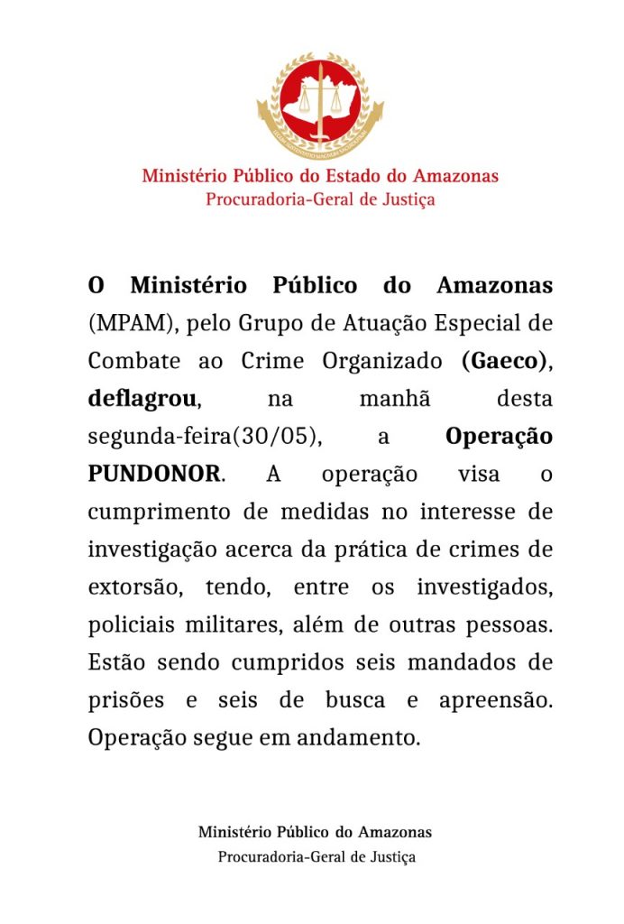 A Polícia Militar do Amazonas (PMAM) informa que está acompanhando o desdobramento das investigações do Ministério Público do Estado (MPE) em relação à operação Pundonor, deflagrada nesta segunda-feira (30/05) pelo Grupo de Atuação Especial de Combate ao Crime Organizado (GAECO) com apoio da Promotoria da Auditoria Militar.