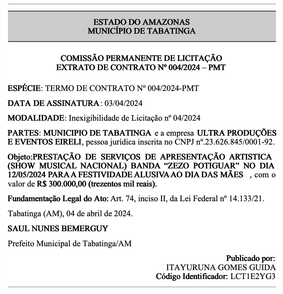 Ainda conforme o documento publicado no Diário Oficial Eletrônico dos Municípios do Estado publicado na última sexta-feira (5), o objetivo é a “PRESTAÇÃO DE SERVIÇOS DE APRESENTAÇÃO ARTISTICA (SHOW MUSICAL NACIONAL) BANDA “ZEZO POTIGUAR” NO DIA 12/05/2024 PARA A FESTIVIDADE ALUSIVA AO DIA DAS MÃES”.