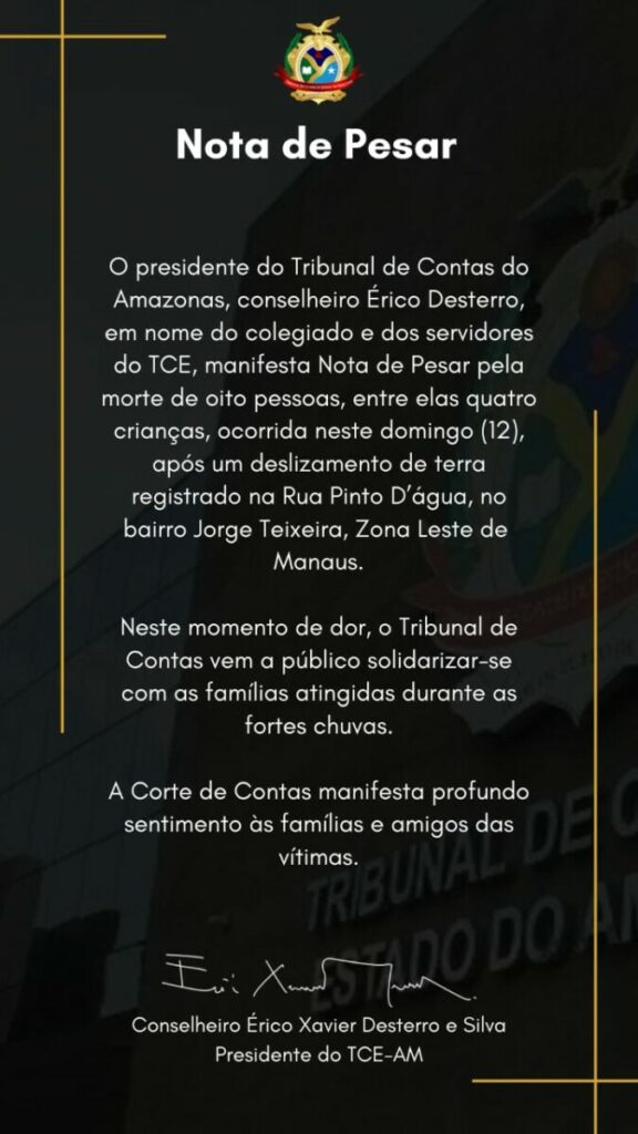 Amazonas – O presidente do Tribunal de Contas do Estado do Amazonas (TCE-AM), conselheiro Érico Desterro, emitiu uma nota de pesar pelas oito vítimas que morreram no deslizamento de terra na noite de domingo (12) no bairro Jorge Teixeira, localizado na zona Leste de Manaus.