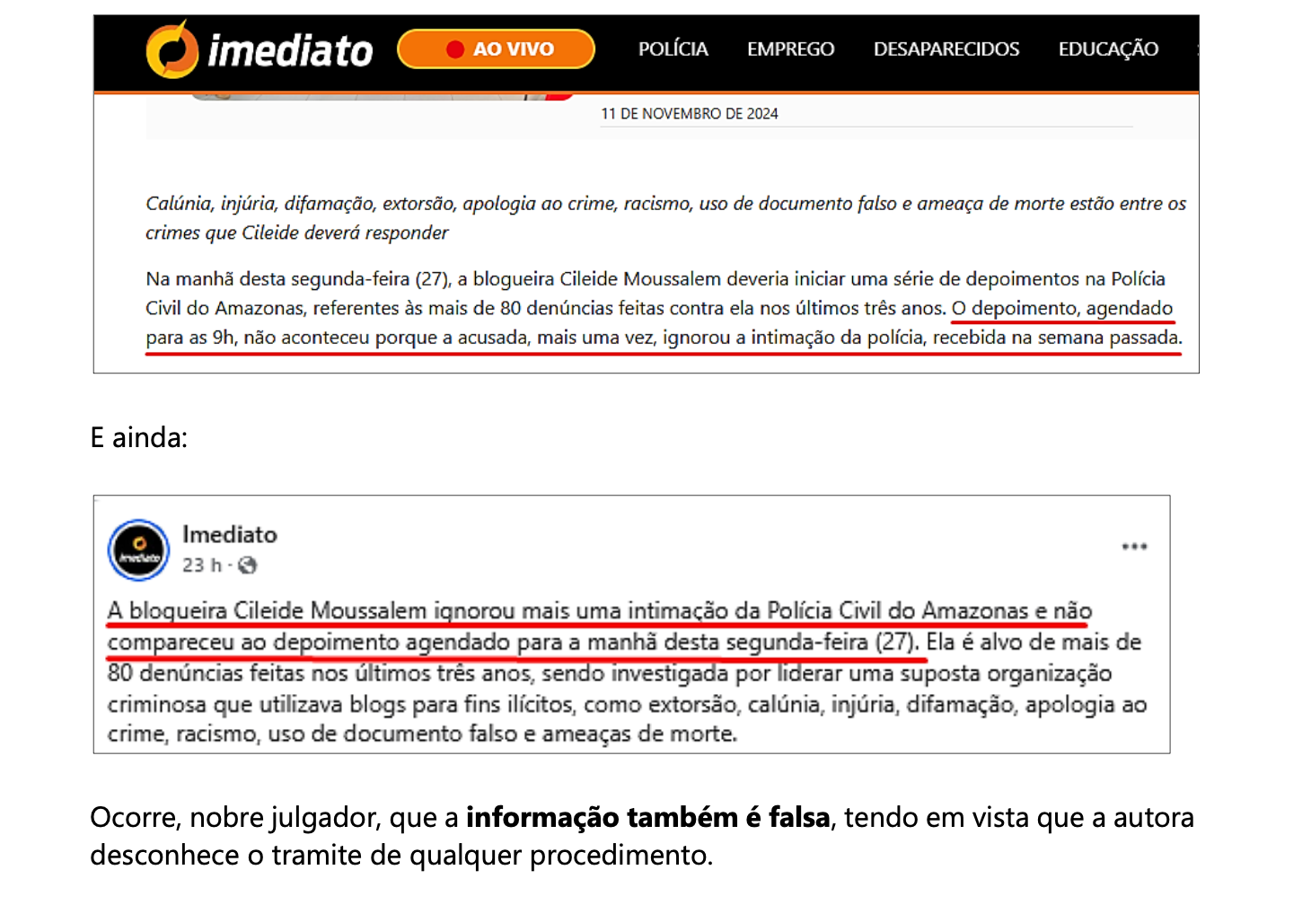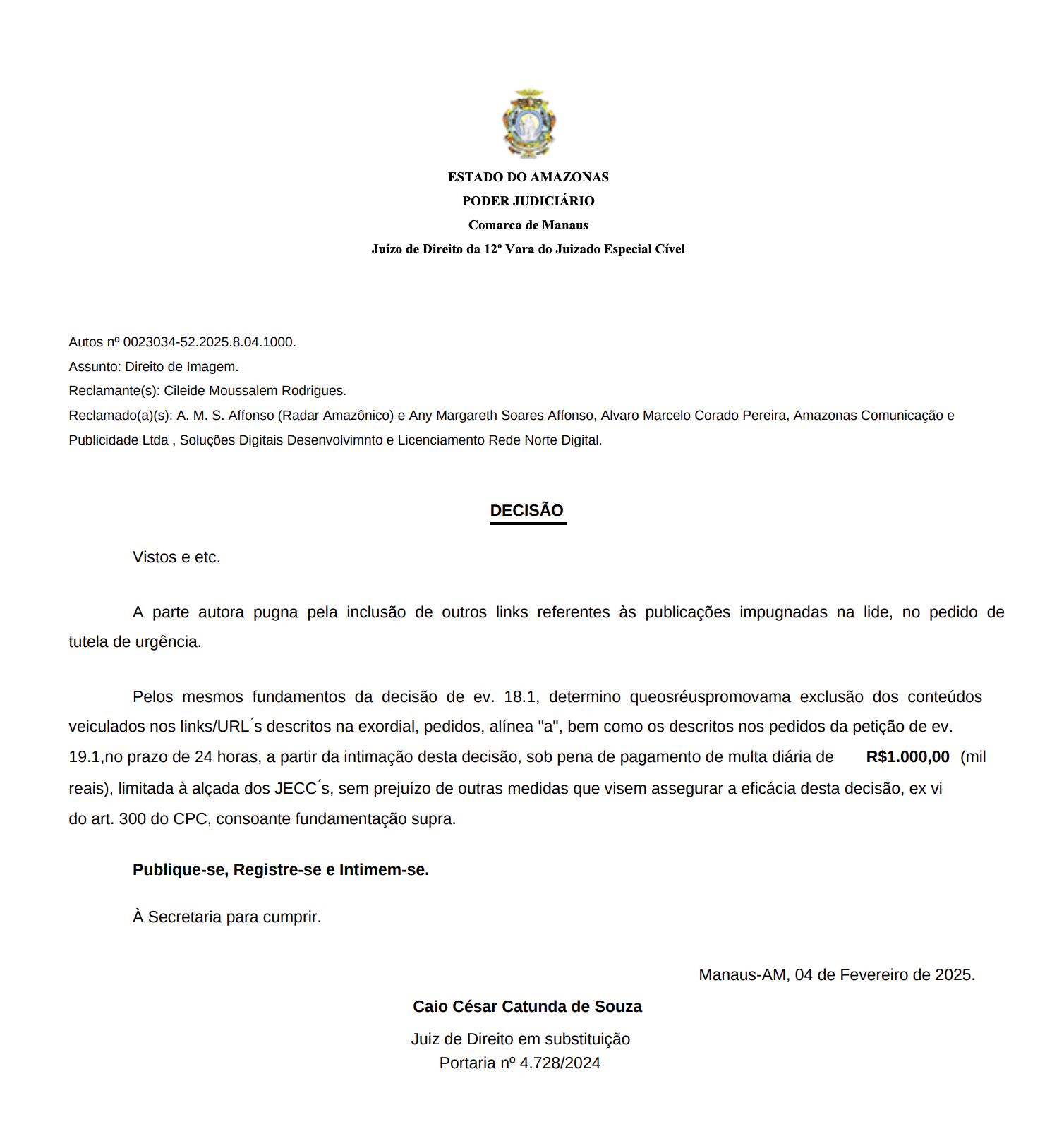 Amazonas – A Justiça do Amazonas deu um importante passo na luta contra a disseminação de fake news, ao ordenar, nesta terça-feira (4), que os blogs Radar Amazônico, Imediato e Revista Cenarium removam, em até 24 horas, conteúdos considerados falsos e prejudiciais à imagem da empresária Cileide Mousallem.
