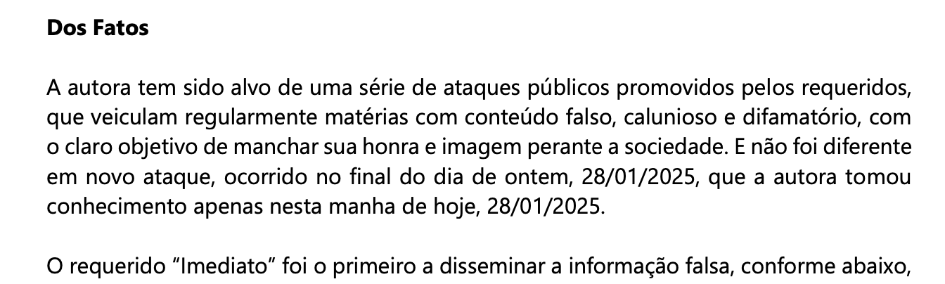 Após ter conquistado a vitória no pedido de remoção de fake news, agora a empresária também exige uma indenização pelo sofrimento e pela repercussão negativa que as matérias geraram em sua vida profissional e pessoal.