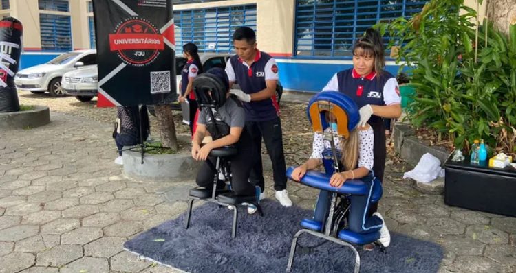 Na unidade de ensino, um grupo montou um espaço de relaxamento para os estudantes com cadeiras de massagem e saco de soco de boxe.
