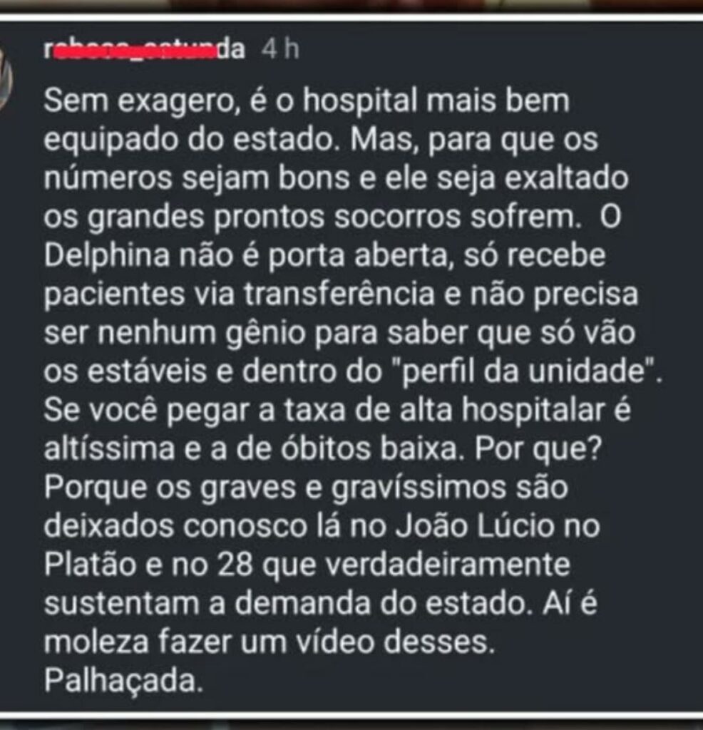 O comentário tem repercutido amplamente, gerando discussões sobre a transparência dos indicadores de saúde pública e a necessidade de equilíbrio na distribuição de recursos entre as unidades. Enquanto alguns defendem o modelo do Delphina Aziz como referência em organização e gestão hospitalar, outros apontam para a sobrecarga enfrentada pelos prontos-socorros, que lidam diariamente com casos de alta gravidade e falta de estrutura.