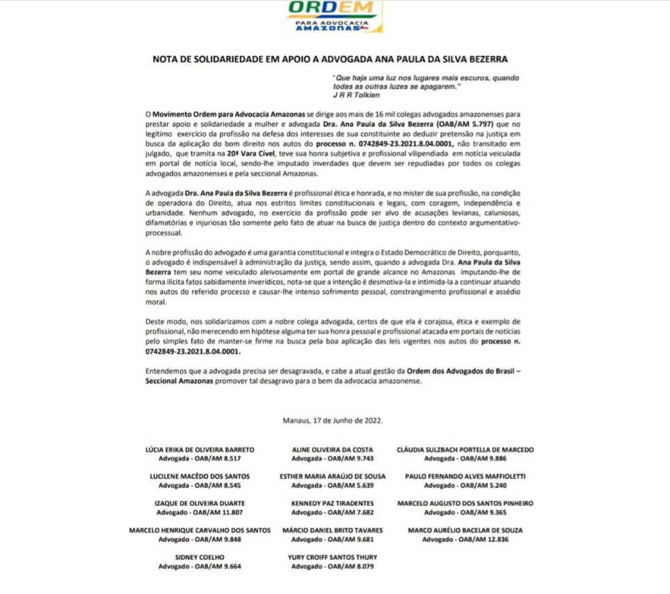 Por mais que a Ordem dos Advogados do Brasil (OAB) tenha se calado diante do ataque direcionado a Ana Paula, um grupo de advogados, que compõe a Ordem Para Advocacia Amazonas, emitiu uma nota de solidariedade em apoio a advogada que foi vítima de Litaiff.