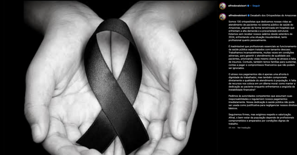 Amazonas – Uma onda de insatisfação surge no sistema de saúde pública do Amazonas, onde 130 ortopedistas expressam sua frustração e desespero devido ao atraso de seus salários, que perdura desde setembro de 2024. Estes profissionais, que trabalham em condições precárias nos hospitais do Estado como terceirizados da região para atender uma demanda já elevada, encontram-se em uma situação insustentável, tanto no aspecto profissional quanto pessoal. É o que relata do Dr.Alfredo Valois em uma nota publicada nesta terça-feira (28/1) em suas redes sociais.