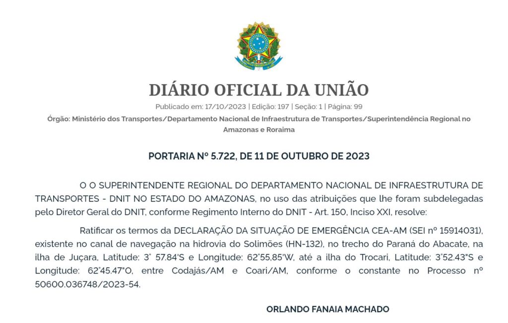 Brasil – A portaria de 11 de outubro, publicada nesta terça-feira (17) pelo Departamento Nacional de Infraestrutura e Transportes (DNIT), declarou situação de emergência no canal de navegação na hidrovia do Solimões, no trecho do Paraná do Abacate, na ilha de Juçara, até a ilha do Trocari, entre Codajás/AM e Coari/AM.
