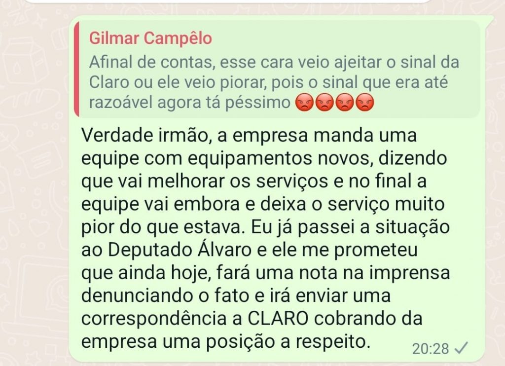 “Aqui a Claro tinha o melhor sinal e a melhor internet. Não era essas coisas, mas pelo menos a gente conseguia baixar um vídeo, abrir um link e conseguíamos até ligar normal. Era um serviço que a gente poderia considerar razoável, mas aí chegou uma equipe em Carauari, passou uma semana, trocaram equipamentos, colocaram uma nova antena de rádio para melhorar o sinal e deixar mais forte e fazer a cobertura dos sinal dos pontos cegos que não atingia em determinados pontos, e a população animada e pensando que o sistema ia melhorar, mas na verdade piorou e piorou feio, porque hoje a gente não consegue acessar nada. A internet está praticamente acho que zero, piorou de vez”, afirmou o vereador.