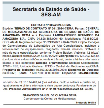 O contrato, que foi formalizado na época sob a assinatura de Francisco Daniel de Oliveira Sena, atual Superintendente Estadual do Ministério da Saúde no Amazonas, delega ao laboratório Reunidos a gestão de serviços de alta complexidade. Esses serviços incluem o fornecimento de equipamentos, reagentes, insumos diversos, software e mão-de-obra especializada, conforme detalhado no Projeto Básico. A escolha do laboratório para gerenciar esses serviços tem gerado questionamentos, uma vez que a ausência de um processo licitatório abre margem para possíveis irregularidades e favoritismos. Atualmente, a CEMA é comandada por Herbenya Silva Peixoto e o contrato permanece em vergência até 31 de janeiro de 2025.