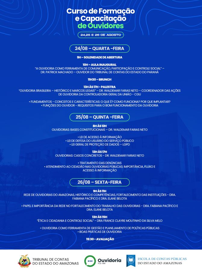 Amazonas – O Tribunal de Contas do Amazonas (TCE-AM), por meio da Ouvidoria e Escola de Contas, realiza o Curso de Formação e Capacitação de Ouvidores que acontecerá nos dias 24, 25 e 26 de agosto, das 9h às 17h.