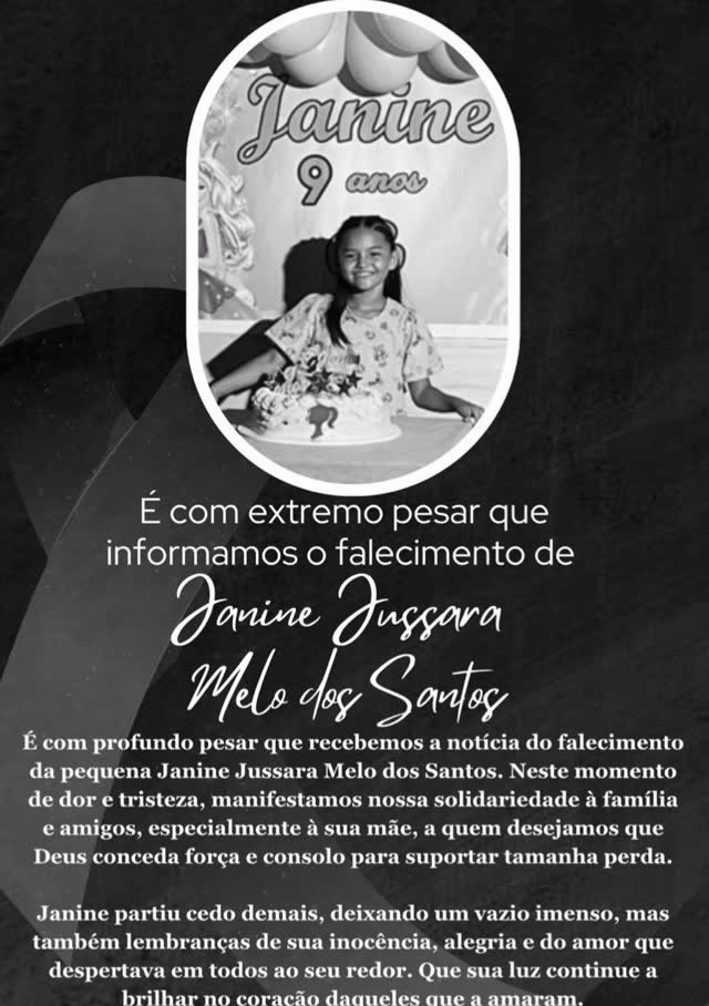 “Neste momento de dor e tristeza, manifestamos nossa solidariedade à família e amigos, especialmente à sua mãe, a quem desejamos que Deus conceda força e consolo para suportar tamanha perda. Janine partiu cedo demais, deixando um vazio imenso, mas também lembranças de sua inocência, alegria e do amor que despertava em todos ao seu redor”, declarou a administração municipal.